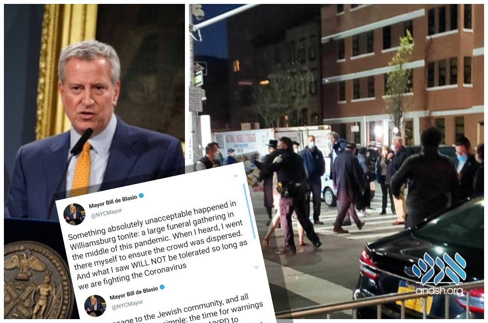 “Something totally unacceptable happened in Williamsburg tonight,” the Mayor tweeted. “A large funeral gathering in the middle of this pandemic… My message to the Jewish community and all communities is this simple: the time for warnings has passed.”