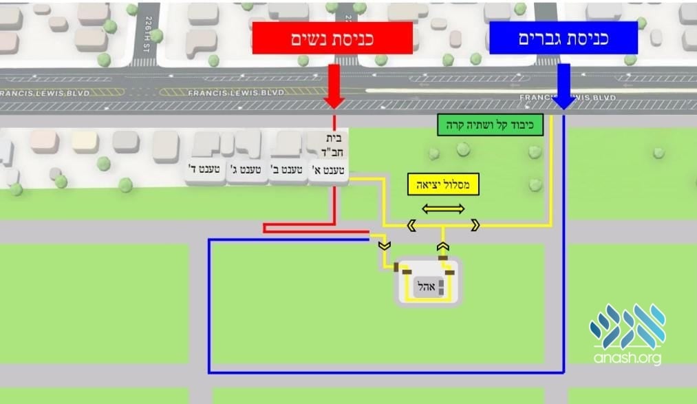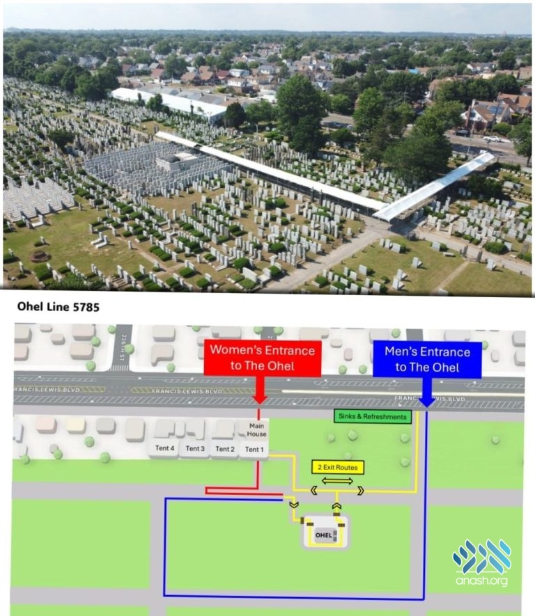 Bochurim, yungeleit, and boys will enter from the main gate of the Montefiore Cemetery on Francis Lewis Boulevard. The entire path will be covered with air-conditioned tents, benches for rest, cold drinks, and videos of the Rebbe. - Women’s Entrance Route: