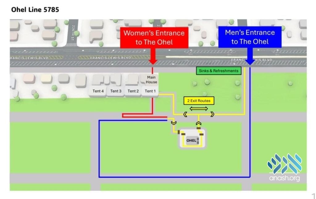 A separate air-conditioned tent has been designated for sleeping, for those who reserved in advance through the official registration site. This area is located in the park across Francis Lewis Boulevard. To reach it, exit the Ohel and turn left for a short five-minute walk. Signage and round-the-clock security will be provided there as well.