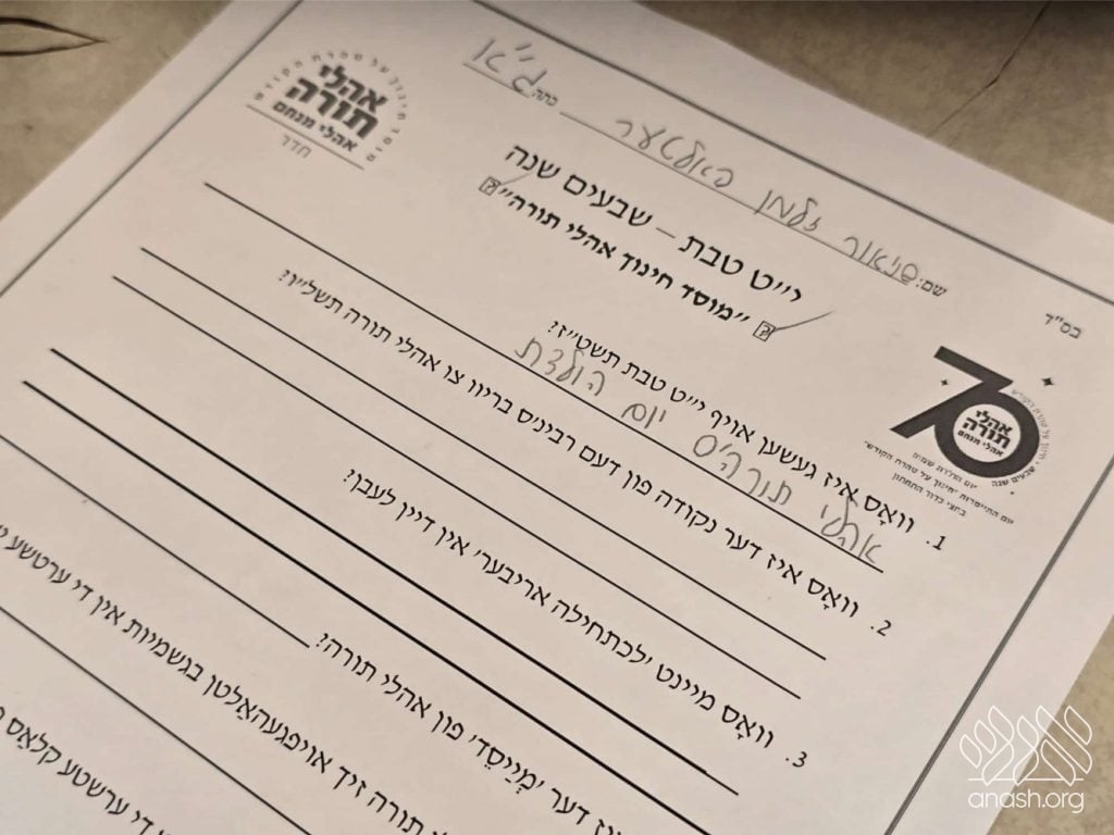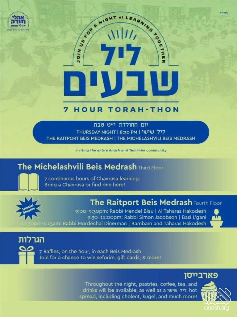 This evening, the celebration extends beyond the preschool and cheder divisions. Beis Medrash Oholei Torah is hosting a special Leil Shishi 7 hour Torah-thon, open to the community. Anash and Temimim are invited to join together in chavrusa learning, special shiurim by Rabbi Simon Jacobson and Rabbi Mordechai Dinerman, 7 raffles on the hour, and leil shishi hot spread.