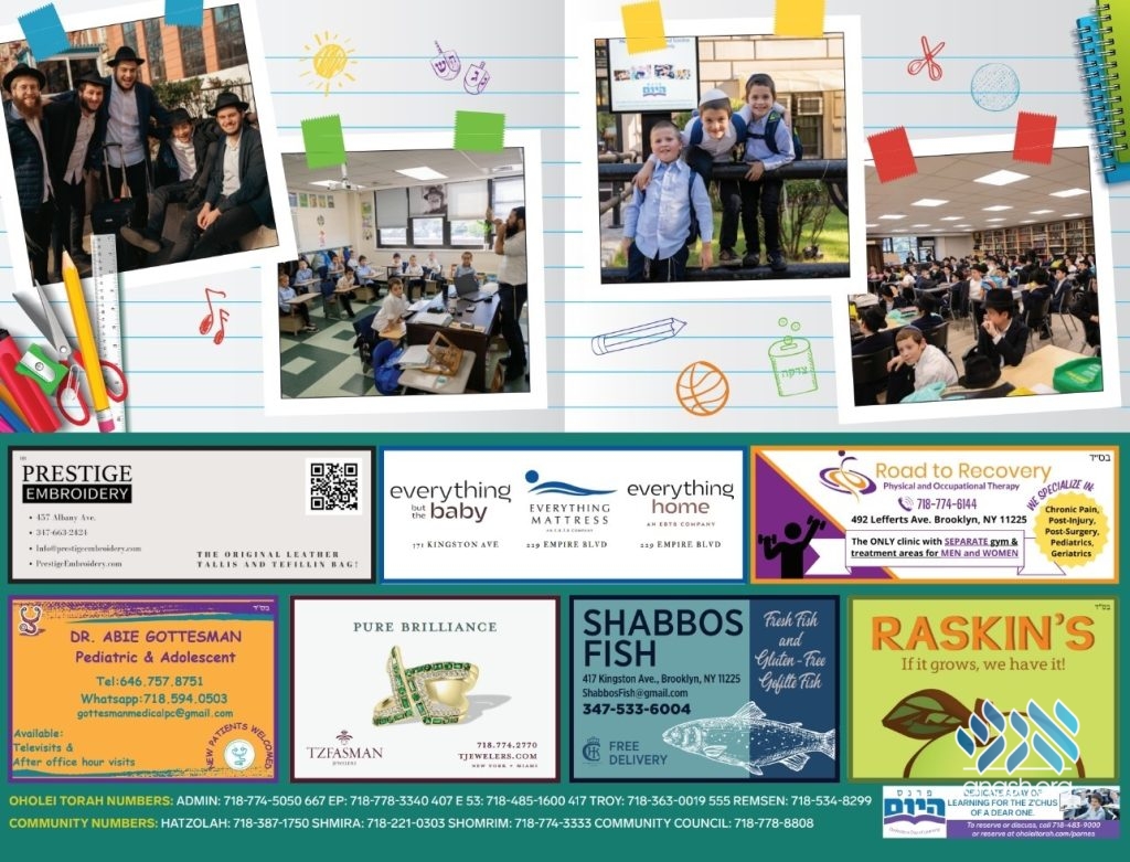 North Shield Insurance, Prestige Embroidery, Road to Recovery Physical and Occupational Therapy, Tzfasman Jewelers, Shabbos Fish, Raskin’s Fruit & Produce, Everything Baby / Everything Mattress / Everything Home, Dr. Abie Gottesman, Acu for Athletes, Brooklyn Brokerage, Yossi Cohen Music, Essel Eyewear, Plumbers Haven, Regency Organic Cleaners, and Table One Catering.