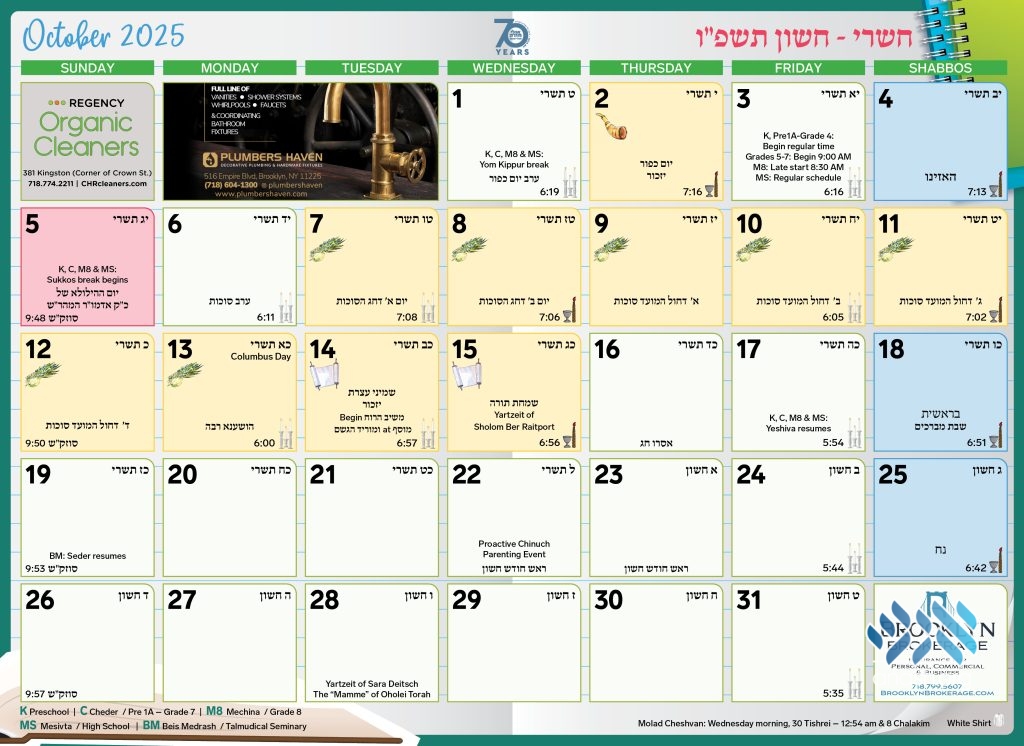 Ahead of the school year, the Oholei Torah Community Calendar for 5786 (2025–26) is now available free of charge at local Crown Heights stores and at the Yeshiva’s main office.