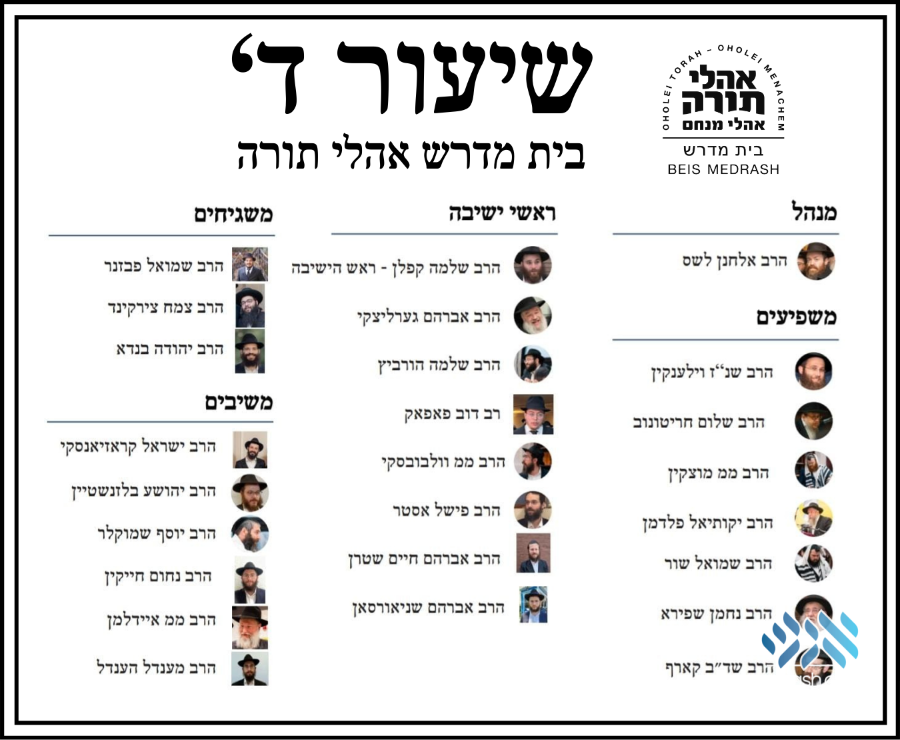 Oholei Torah is privileged to welcome Rabbi Avrohom Shneersohn alongside our distinguished Roshei Yeshiva Rabbi Avrohom Chaim Stern and Rabbi Dov Popack who joined last year, as well as Rabbi Fishel Oster, Rabbi Avrohom Gerlitzky, Rabbi Shlomo Hurwitz, Rabbi Mendel Wolvovsky, and Rosh Hayeshiva Rabbi Shlomo Kaplan.