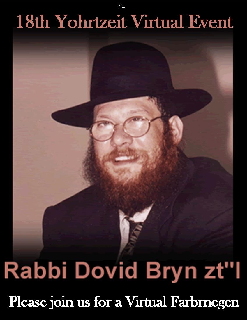 The 18th Yartzeit Of Rabbi Dovid Bryn will be marked tonight with an online farbrengen. Rabbi Bryn was a Chasid, a Teacher and a Friend, who left this world too soon, but who touched the lives of thousands.