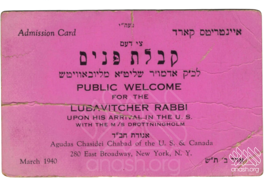 An admission card for the official welcome of the Frierdiker Rebbe at Pier 97 in New York Harbor, tells the story of the miraculous journey from war-torn Europe, the yearning of chassidim to see their Rebbe, and the establishment of Lubavitch in America.