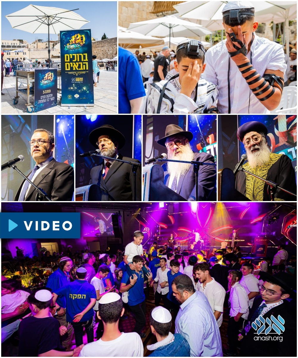 The celebration began at the Kosel, in the early morning. The 120 boys arrived together with their families, where they received a pair of Tefillin as a gift, prepared by Chesed Menachem Mendel, the educational division of Collel Chabad. After davening and joyous dancing, the group proceeded to the Jerusalem Convention Center at Binyanei Hauma where an elaborate dinner celebration was held.