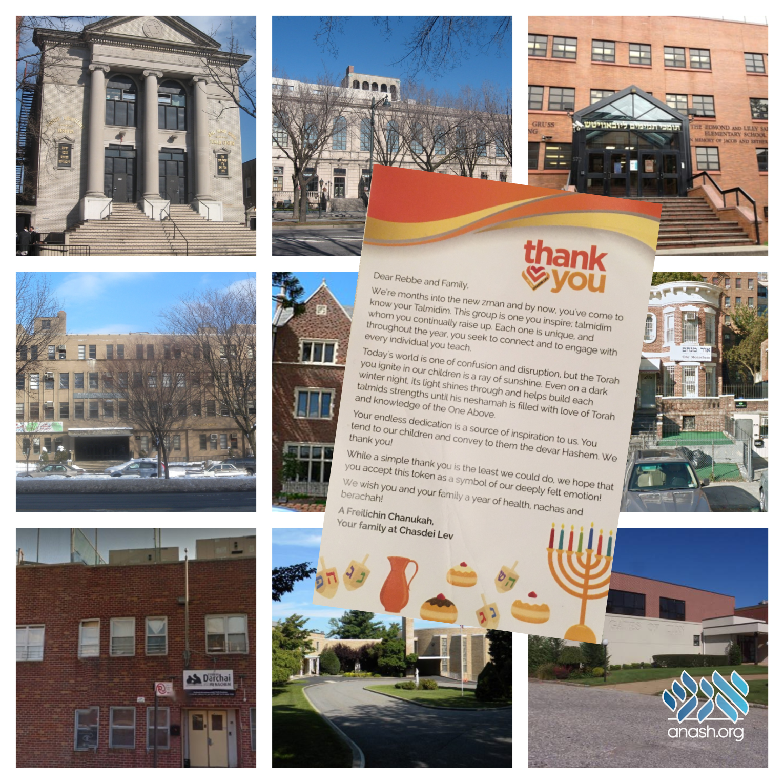 This Chanukah, over 400 teachers of Lubavitch Elementary schools, Mesivtas and Zals throughout Crown Heights and surrounding neighborhoods, found a surprise Chanukah gift pack for their families in their mailboxes.
