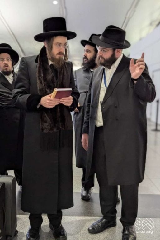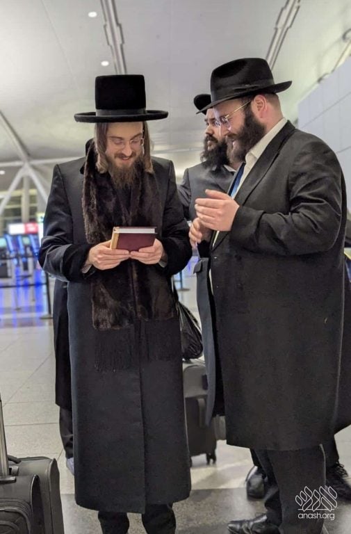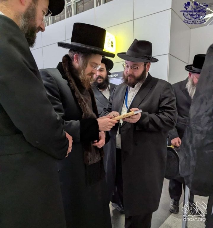 The young Sadigura Rebbe was presented with a sefer of the Rebbe on refuah by Rabbi Shmuly Butler of Chabad Air at JFK airport.