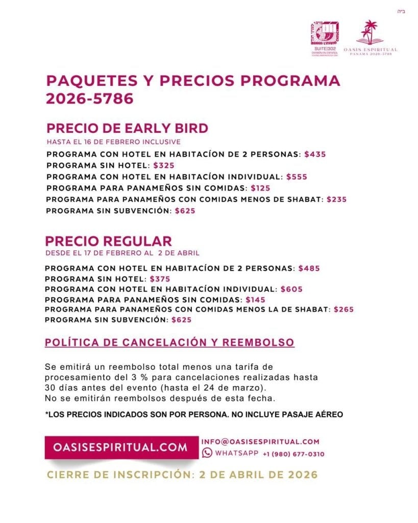 The retreat takes place in Panama City’s vibrant Jewish neighborhood, with participants staying in a luxurious four-star hotel. The program includes Spanish-language classes and lectures with renowned rabbis and rebbetzins, interactive workshops, personal coaching sessions, and gourmet kosher meals throughout.