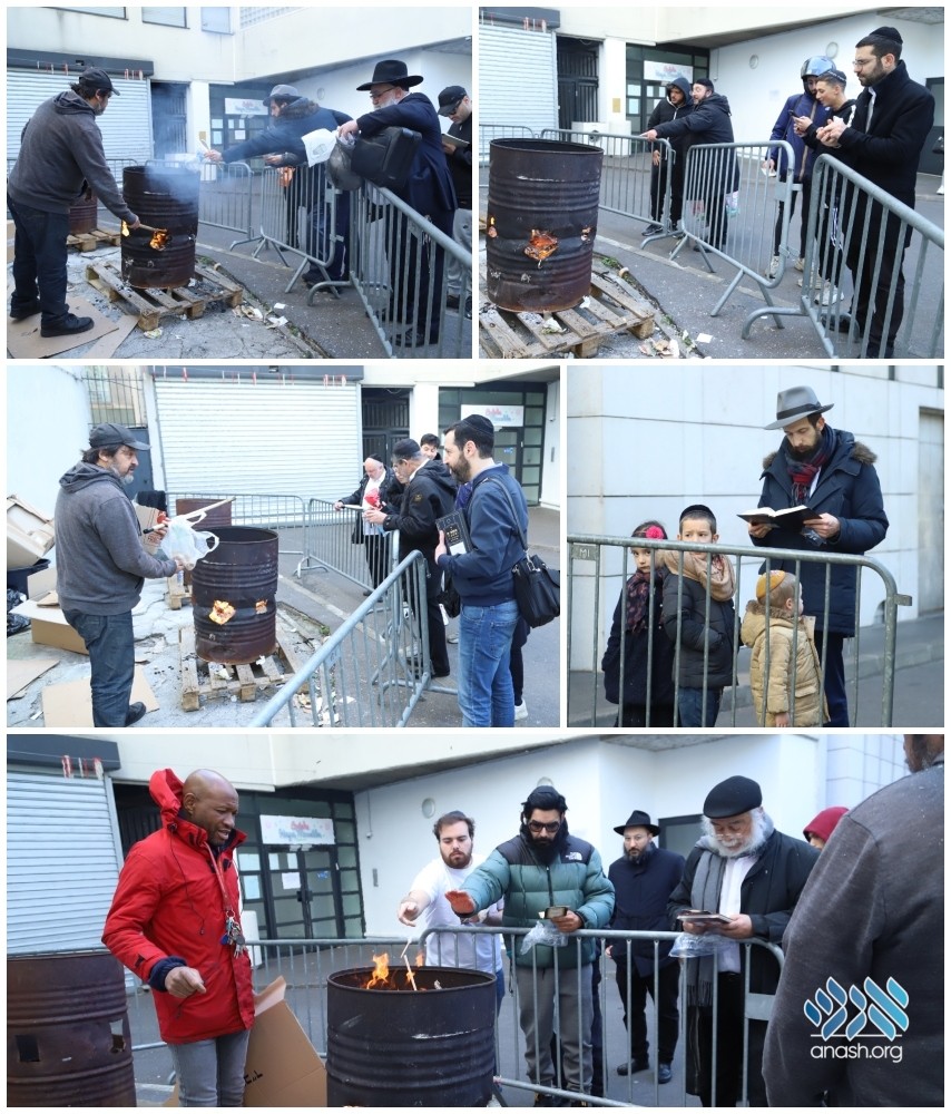 Residents of Paris, France gathered in front of the Beis Chaya Mushka Chabad Center on Wednesday, Erev Pesach, to burn their remaining pieces of chometz.