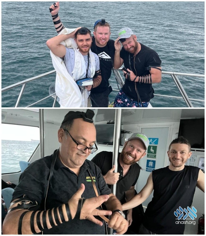 Upon discovering that the captain of the boat was Jewish, three of the CYPs: Matt Birkinshaw of San Antonio, TX, Jonothan Ambar of Orlando, FL, and Nitzan Goodman of Plano, TX, decided to share the Mitzvah with the boat’s captain and persuaded him to don Tefillin as well.