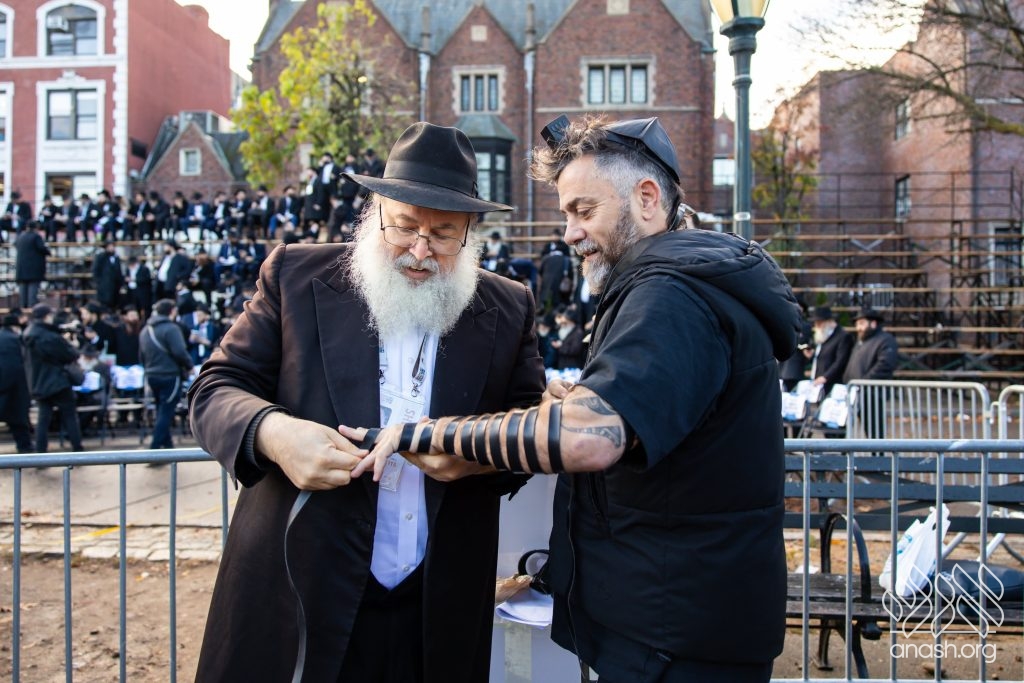 Never a moment to waste, Shluchim spent the time waiting for the Kinus photo by learning their daily shiurim, putting on Teffilin with Jewish media staff, messaging community members, and catching up with old friends.