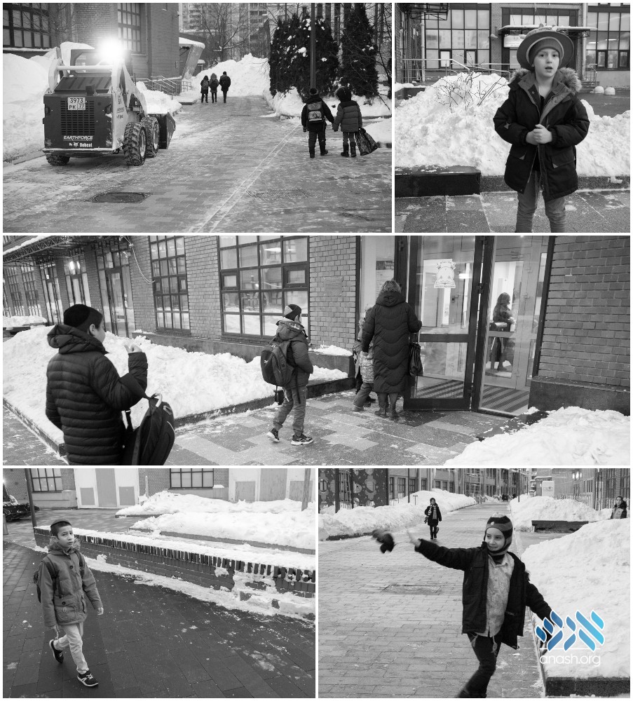 Alexei Kunin is a talented photographer residing in Moscow. His black and white photography exhibits are of international fame. This week, he arrived at the Marina Roscha neighborhood in the early morning hours to photograph Jewish children walking to their schools, after snowmobiles had cleaned the territory all night.
