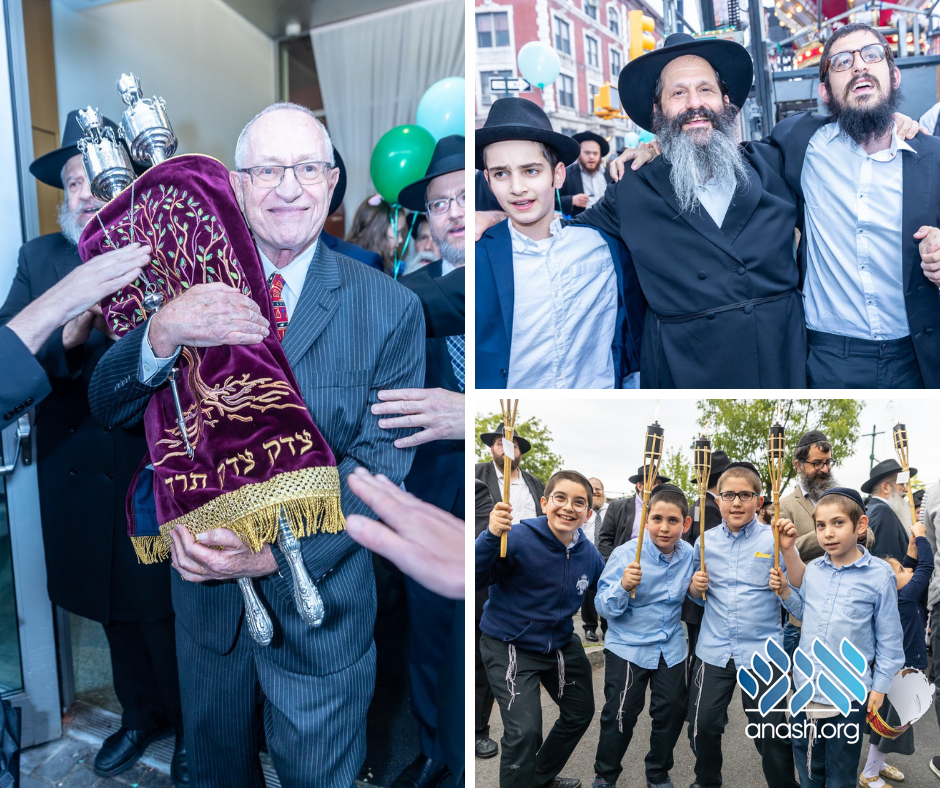 The newly completed Sefer Torah honoring Professor Alan Dershowitz was brought to 770 for Hakafos amid joyous music and dancing.