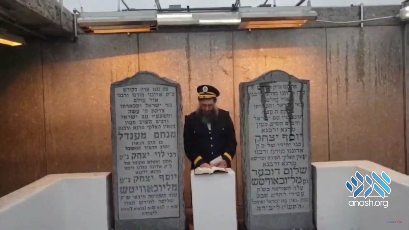 Rabbi Shimmy Weinbaum of Tzivos Hashem davens by the Ohel as part of the children’s global davening from the Kosel, the Mearas Hamachpela and the Ohel of the Rebbe in New York.
