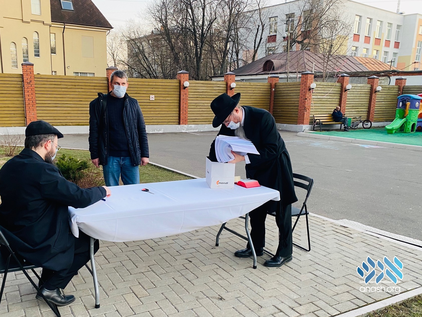 Chief Rabbi of Russia, Rabbi Berel Lazar, sells Russia’s chometz outdoors with a face mask, due to fear of spreading the virus.