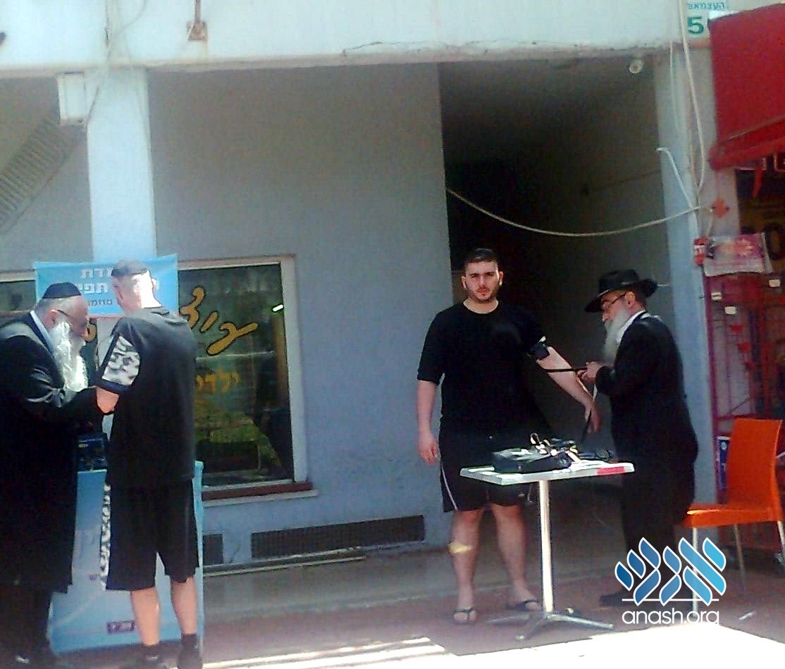 Rabbi Yitzchok Goldberg, Rosh Yeshiva, Yeshiva Tomchei Tmimim in Migdal Haemek, and Rabbi Yosef Yitzchok Gurevitch, mashpia, spend part of their Friday afternoon helping their fellow Jews put on tefillin.