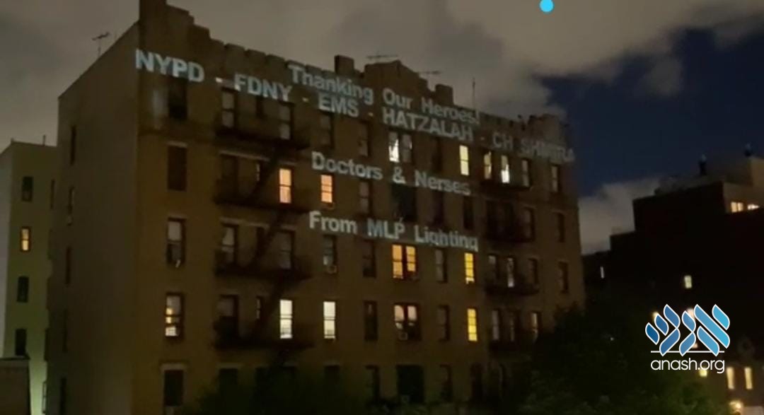 A light show in Crown Heights by MLP lighting thanked first responders: NYPD, FDNY, EMS, Hatzalah, and Crown Heights Shmira, as well as doctors and nurses fighting the virus.