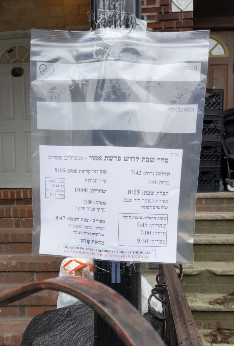 Following the Crown Heights Rabbonim’s letter permitting “porch minyanim,” a sign was put up on Sterling Street in Crown Heights detailing the davening times and even a Motzei Shabbos video of the Rebbe.
