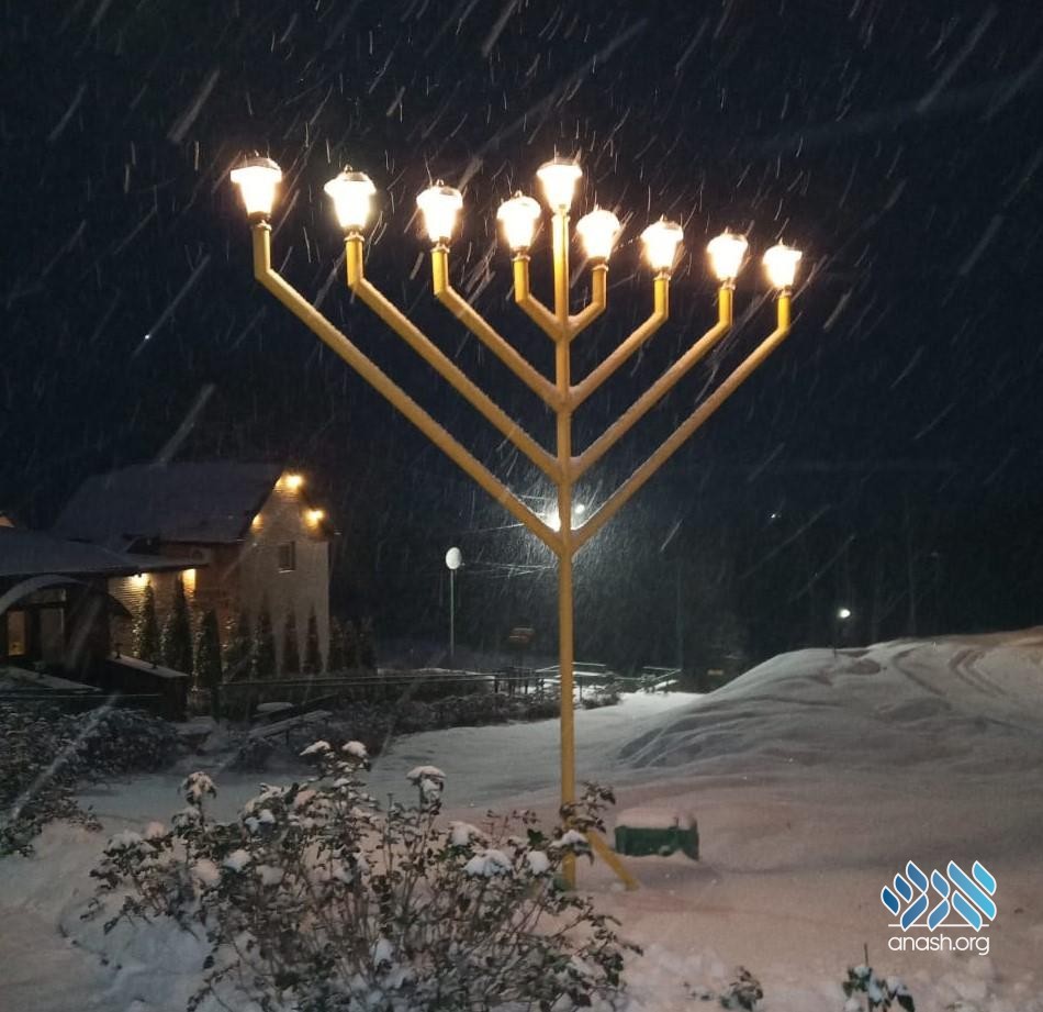 The candles of the outdoor menorah shine brightly in the snow outside the Alter Rebbe’s Ohel in Haditch.