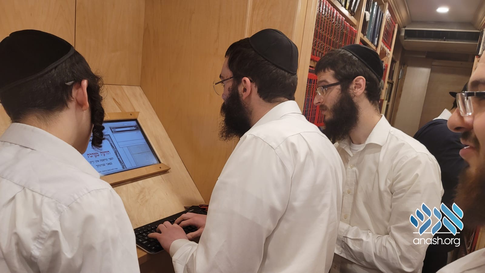 Bochurim at the 770 Yeshiva enjoy the newly installed Otzar Hachochmo computer system containing over 110,000 seforim inside the new library at the back of 770.