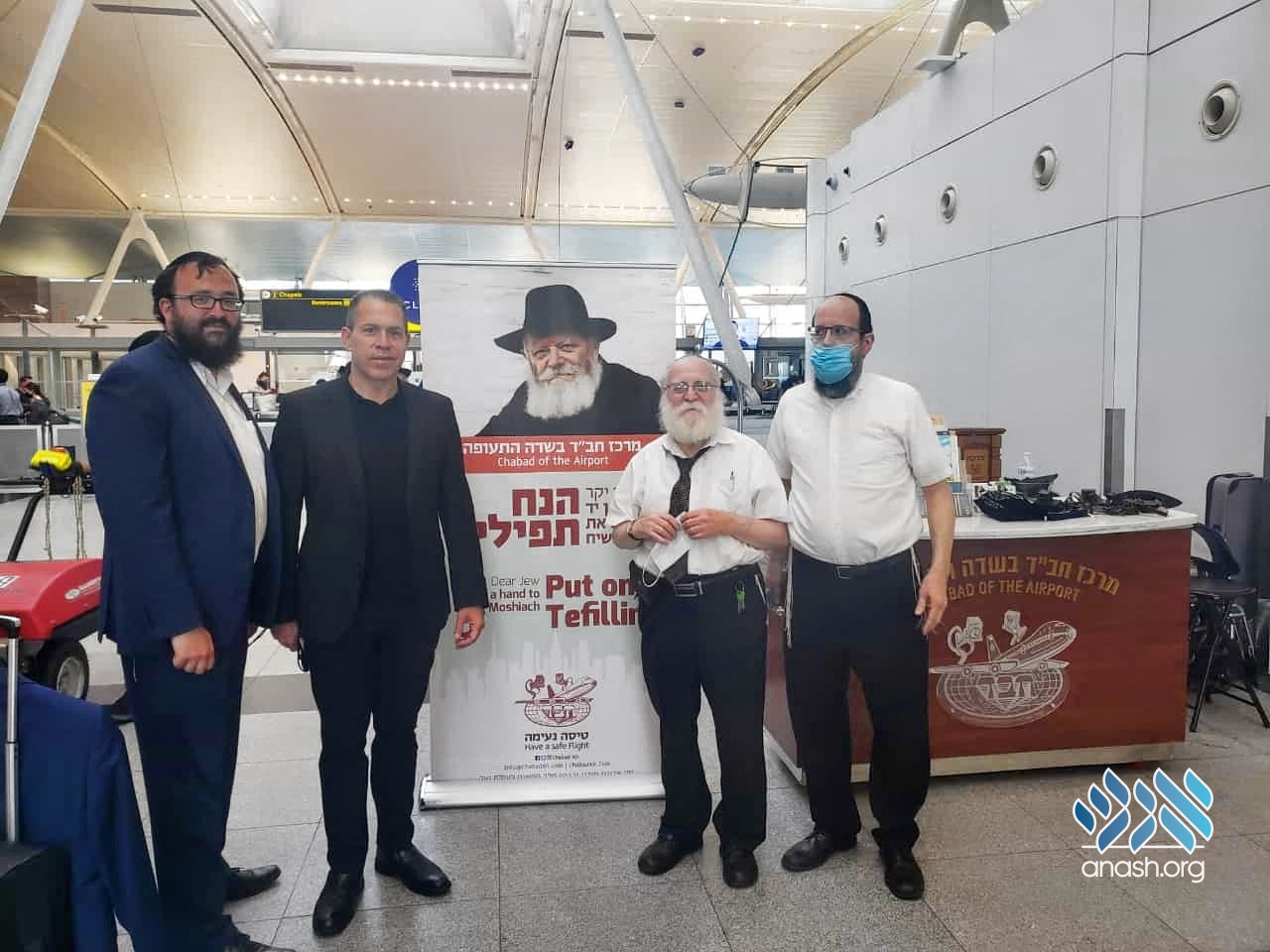 Israeli Ambassador to the United Nations Gilad Erdan visited the Chabad Air Tefillin stand at JFK Airport on his return trip to Eretz Yisroel on Sunday evening.