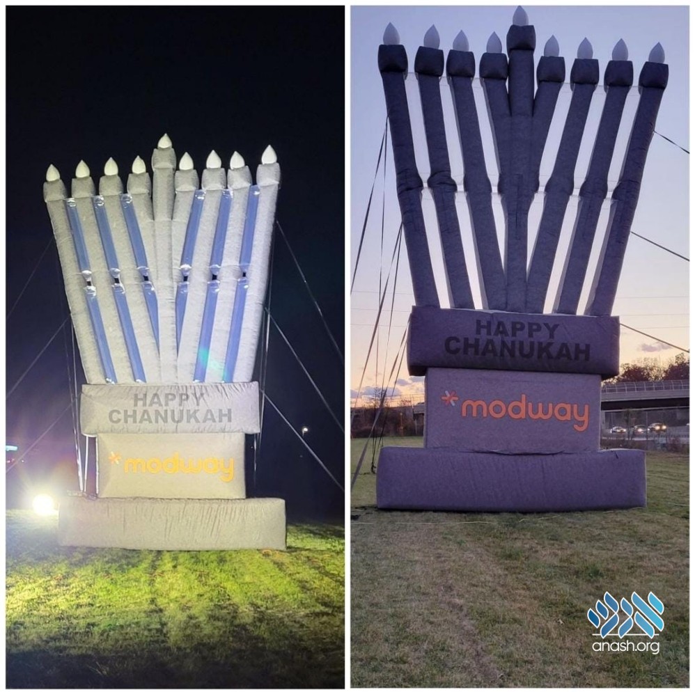 A large inflatable menorah stands on the front lawn of Modway Furniture, illuminating the New Jersey Turnpike. The menorah was made possible by Rabbi Levi Azimov of Chabad of South Brunswick, NJ