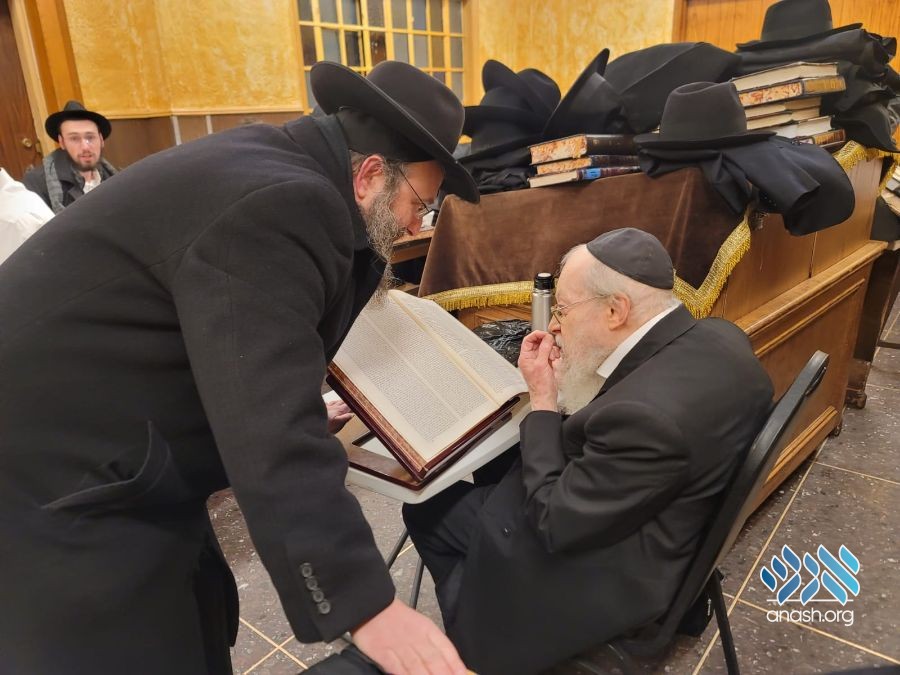 Crown Heights rov Rabbi Yosef Braun discusses rabbinic matters with senior rov Rabbi Avrohom Osdoba at his position as meishiv at the yeshiva in 770.