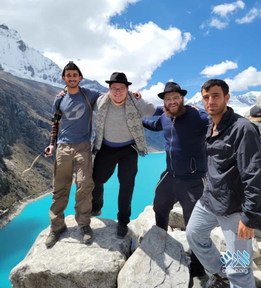 Bochurim Chaim Kudan and Aharon Leib Greene put on tefillin with Israeli backpackers by the Mirador lookout which overlooks Peru’s famous Lake Paron, at 4200 m (13,780 ft) above sea level.