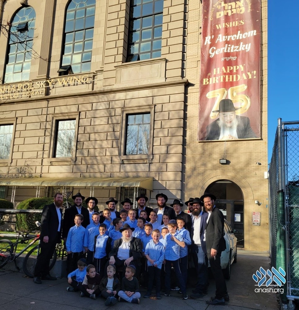 Members of the extended Gerlitzky family who learn or teach in Oholei Torah school gather to wish Rabbi Avraham Gerlitzky a happy 75th birthday and posed for a group photo.