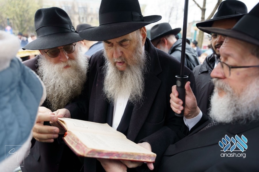 Rabbi Moshe Kotlarsky recites kol chamira after burning the chometz from a Haggadah Shel Pesach that was gifted by the Rebbe and owned by Rabbi Levi Garelik.