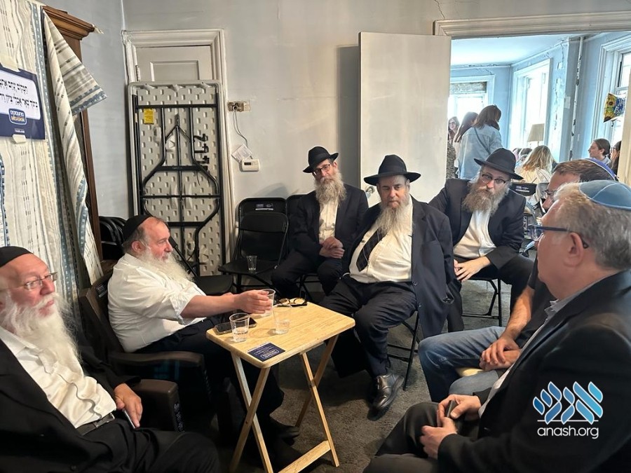 Merkos vice-chairman Rabbi Moshe Kotlarsky and world-renowned oncologist Dr. Shalom Kalnicki pay a shiva visit to Rabbis Yossi and Leibel Schildkraut, who are sitting shiva after the passing of their mother Mrs. Ray Schildkraut.