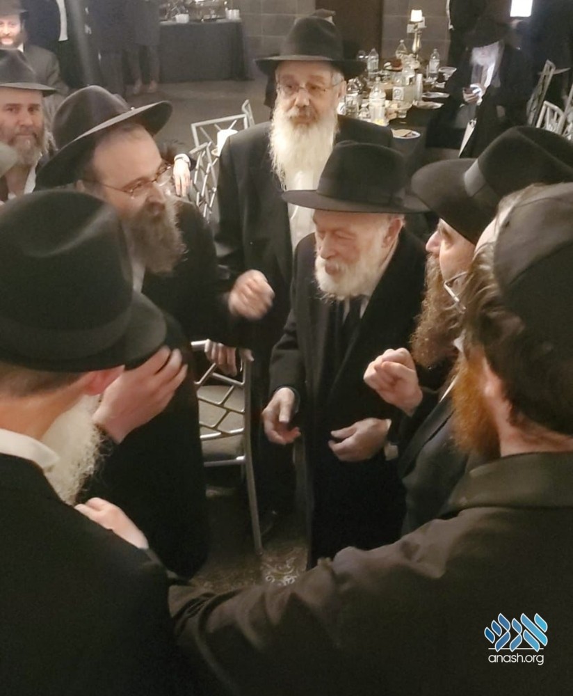Achdus between chassidim: At a l’chaim in Crown Heights on Tuesday night, an animated conversation took place between Harav Yosef Braun, Rabbi Yehuda Krinsky, Rabbi Gedalya Shemtov, Rabbi Dovid Nachshon, and R’ Moshe Pinson.