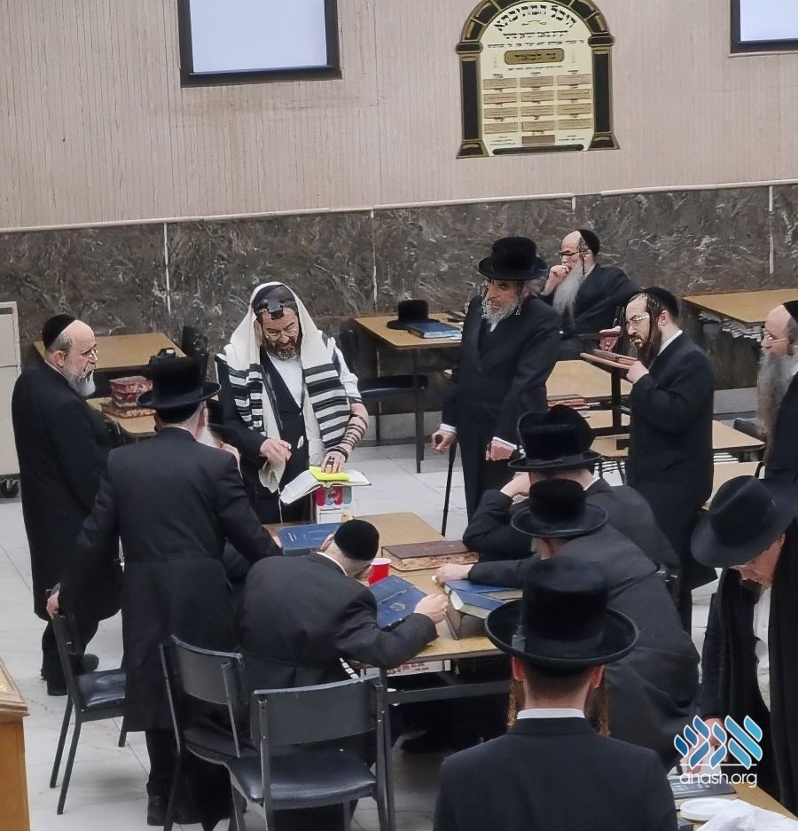 After shacharis in the Sanz-Klausenburg Beis Medrash in Union City, NJ, Hoboken shliach Rabbi Moshe Schapiro made a Siyum Horambam, with the participation of Harav Shaul Yehuda Prizant, rov of the community and son-in-law of the Sanz-Klausenburg Rebbe, dayan Rabbi Yaakov Haskal, and members of the Kolel.