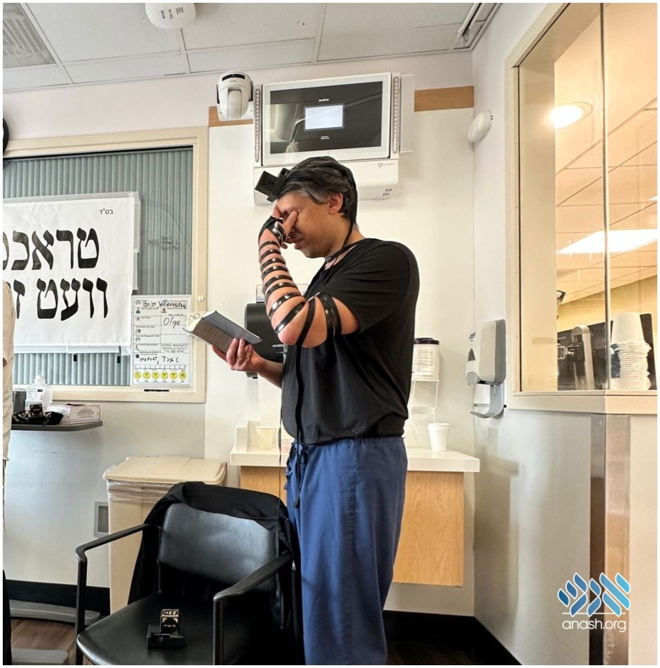 The doctor of Mendel Bluming, the 15 year old bochur who is in serious condition after being hit by a car, lays tefillin with Mendel’s tefillin and says Shema in his Chitas.