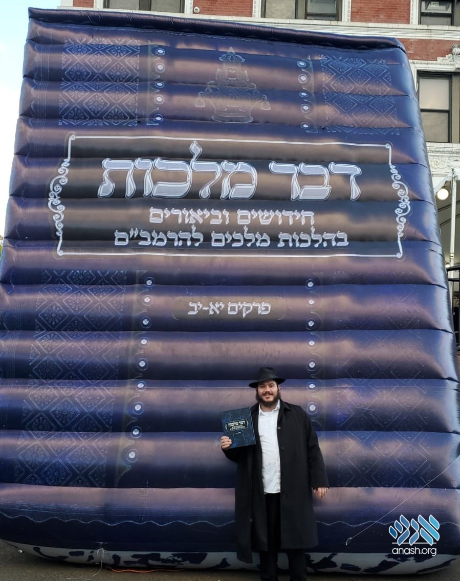 A huge inflatable Dvar Malchus on the Rambam Hilchos Moshiach greets visitors to 770 promoting the landmark sefer of the Rebbe’s sichos compiled by Rabbi Menachem Mendel Ezagui.