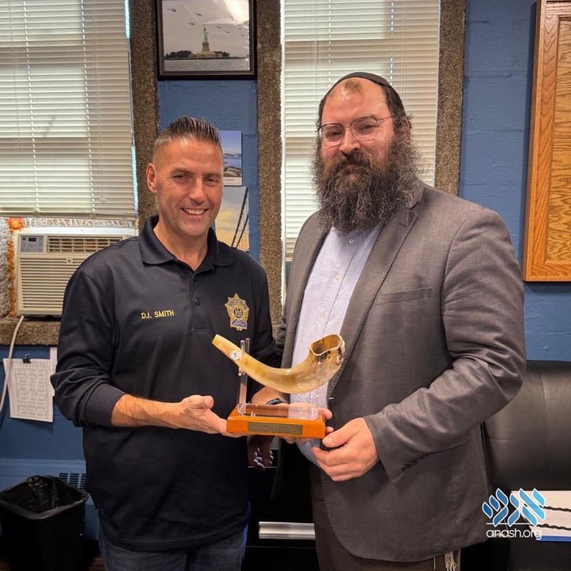 Members of the Vaad Hakhol presented Deputy Inspector at 71st Precinct Thomas P. Smith with a unique Shofar gift with a plaque recognizing his dedication in service to the Crown Heights community.