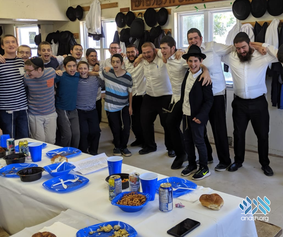 Camper Sholom Hurwitz, son of shliach Rabbi Yitzi Hurwitz, celebrates his Bar Mitzvah with fellow young shluchim from California, at Camp Gan Yisroel in Montreal.