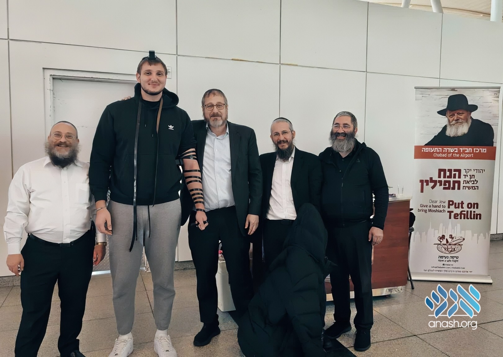 “And all the nations will see”: A particularly tall traveler was seen donning tefillin today at the Chabad Air stand at JFK Airport manned by Yossi Cohen, Moshe Shmukler, Zalman Tevel, and Levi Liberow.