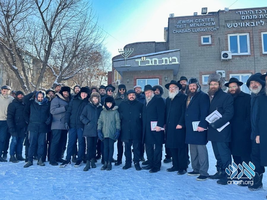 Members of the Anshei Lubavitch shul of Crown Heights, accompanied by their rov, Rabbi Yossi Garelik, pose in Alma Ata, Kazakhstan, with shliach Rabbi Yeshaya Cohen. They traveled there to visit the kever of the Reb Levik, the Rebbe’s father.