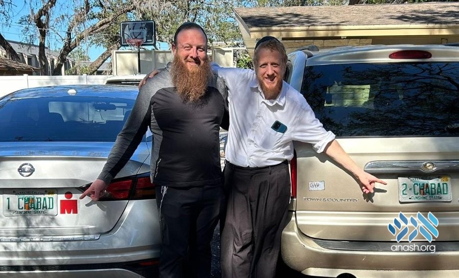 Florida shluchim, Rabbi Levi Hodakov of Clearwater, and Rabbi Nochum Kurinsky of Chabad at the Beaches in Ponte Vedra Beach, pose with their matching Chabad license plates “1 Chabad” and “2 Chabad.”