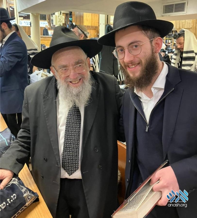 Harav Michel Shurkin, Rosh Yeshiva of Yeshivas Toras Moshe in Yerushalayim and a close talmid of Harav Moshe Feinstein, stopped in 770 to daven shachris, after which he posed for a photo with a relative.