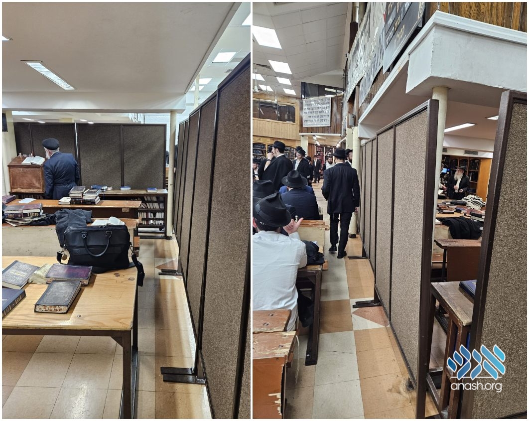 Following ten years of daily use, the mechitzos separating between the minyonim under the Ezras Noshim in 770 have been updated with new fabric walls to beautify the shul.