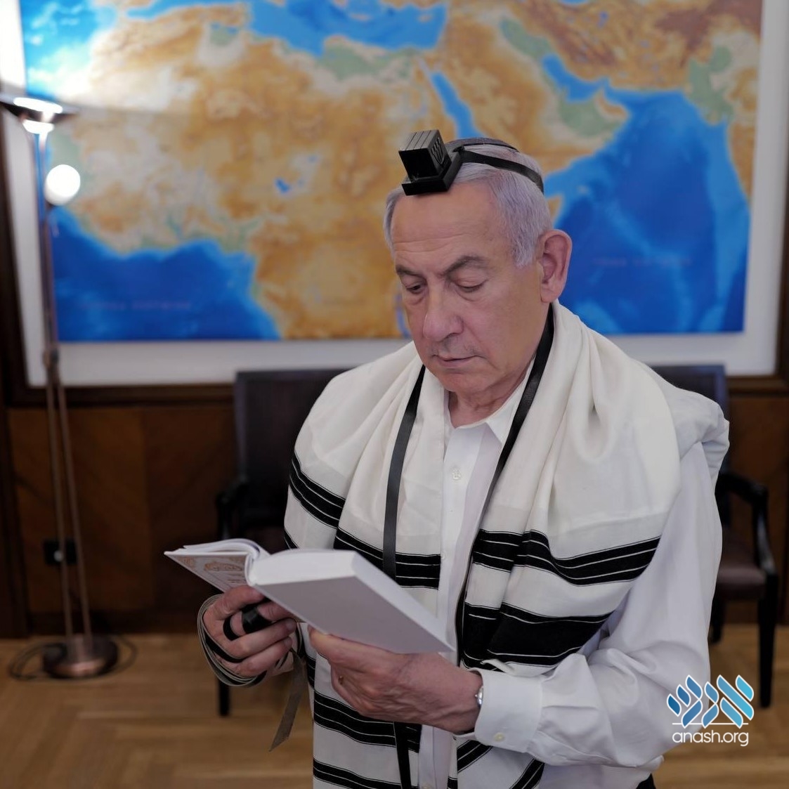 Today, Prime Minister Benyamin Netanyahu put on the tefillin of Maj. (res.) Yossi Hershkovitz, a soldier killed in Gaza, in his memory. Netanyahu was also seen wearing a Chabad talis.