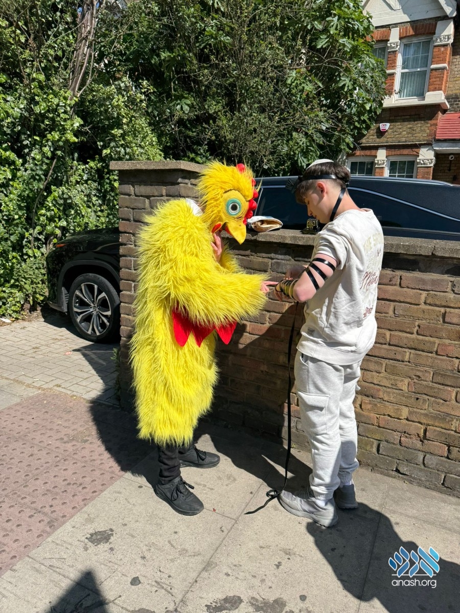 With no time to lose, a bochur from Kingsley Way Yeshiva, still dressed in a chicken costume from the Lag B’Omer parade in Stamford Hill, London, went straight to his mivtzoim route and helped another Yid put on tefillin.