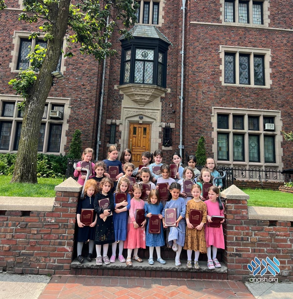 Girls from Pre-1-Alef of Beis Chaya Mushka in Crown Heights who recently received their first siddur went to 770 to daven together from their newly acquired siddurim.