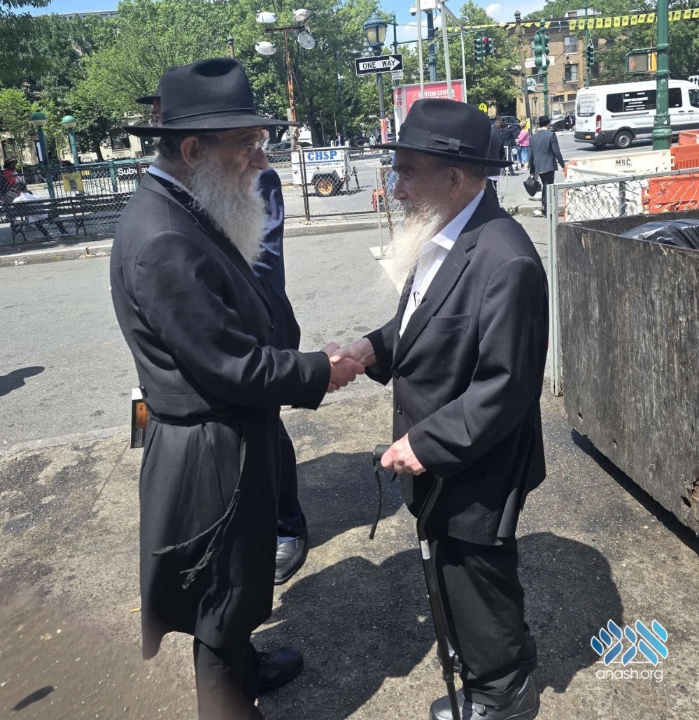 Rabbi Avraham Shemtov, chairman of Aguch and Bais Rivka schools, director of Camp Gan Yisrael in Parksville, NY, and shliach to Philadelphia and Capitol Hill, greets Rabbi Nachman Schapiro, senior mashpia at Beis Medrash Oholei Torah, in front of 770.