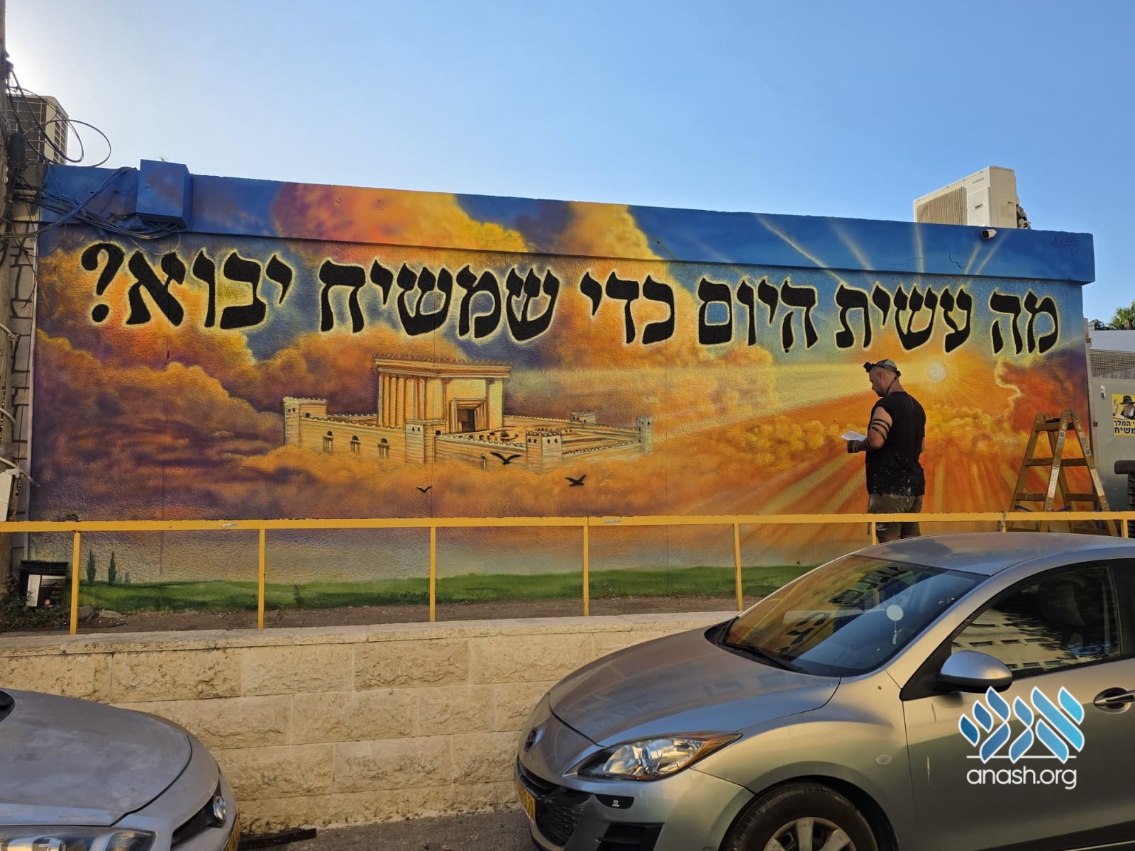 A gorgeous mural painted today in Nachlas Har Chabad inspires passersby with the opening of Hayom Yom, “What have you done today so that Moshiach should come?” Upon completion, one of the painters put on tefillin and stood to daven near the new mural.
