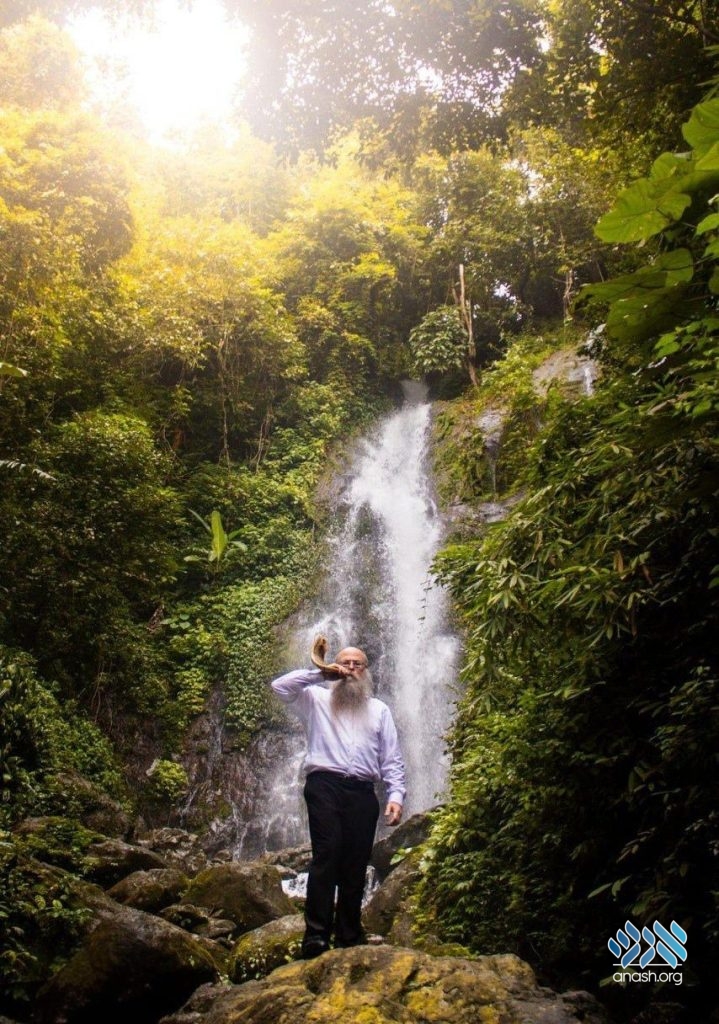 In the midst of Chodesh Elul, Rabbi Nechemia Wilhelm, the Rebbe’s shliach in Bangkok, Thailand, blows shofar for Jewish backpackers at the foot of a beautiful waterfall in the Thai countryside.