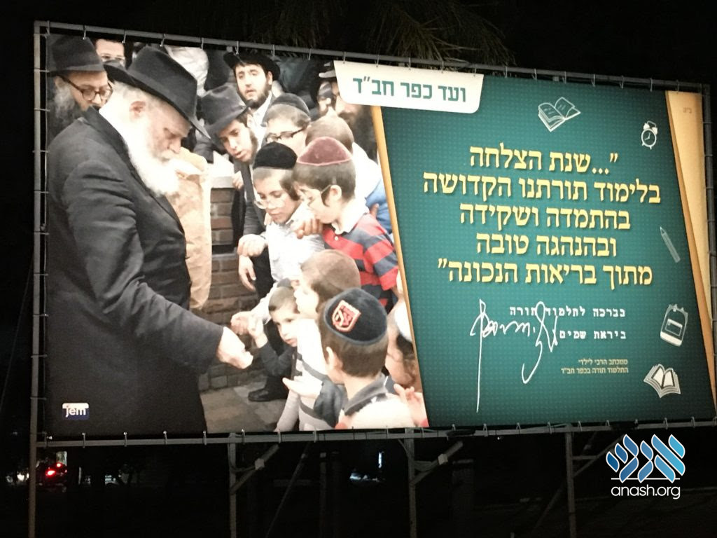 Alongside a stunning JEM picture of the Rebbe handing out tzedakah coins to children, the new sign reads “… A successful year in learning our holy Torah diligently and seriously; in good conduct and in good health… with blessing for learning Torah with fear of Heaven…”